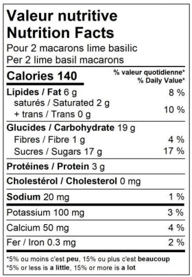 Shell: Sugar, Ground almond, Liquid egg white, Corn starch, Water, Food coloring preparation (water, high fructose corn syrup, glycerin, sunset yellow FCF, tartrazine, sugar, modified corn starch, brilliant blue FCF, citric acid, sodium benzoate and potassium sorbate, carrageenan gum, xanthan gum), Dry albumen, Charcoal. Filling: White chocolate (sugar, cocoa butter, whole milk powder, soy lecithin, natural vanilla flavour), Lime juice, Fresh basil, Starch preparation (modified corn starch, vanillin, beta carotene, riboflavin), Beta-carotene, Spirulina.