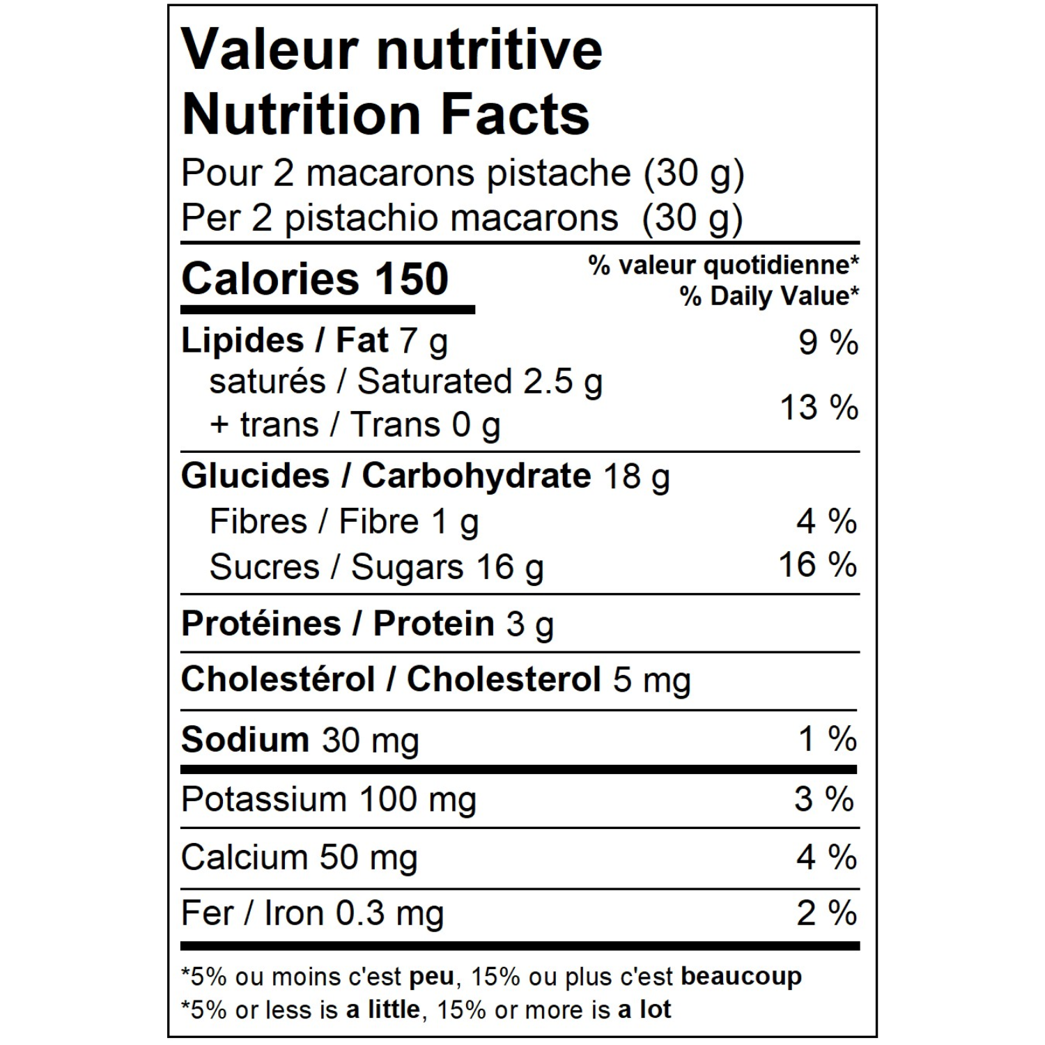 Coquille : Sucre, Amande en poudre, Blanc d’œuf liquide, Amidon de maïs, Eau, Bêta-carotène, Extrait de spiruline. Intérieur : Chocolat blanc (sucre, beurre de cacao, poudre de lait entier, lécithine de soya, extrait de vanille), Crème 35% M.G. (crème, carraghénane), Pistache, Lait écrémé en poudre, Glycérol, Bêta-carotène, Extrait de spiruline, Sel.